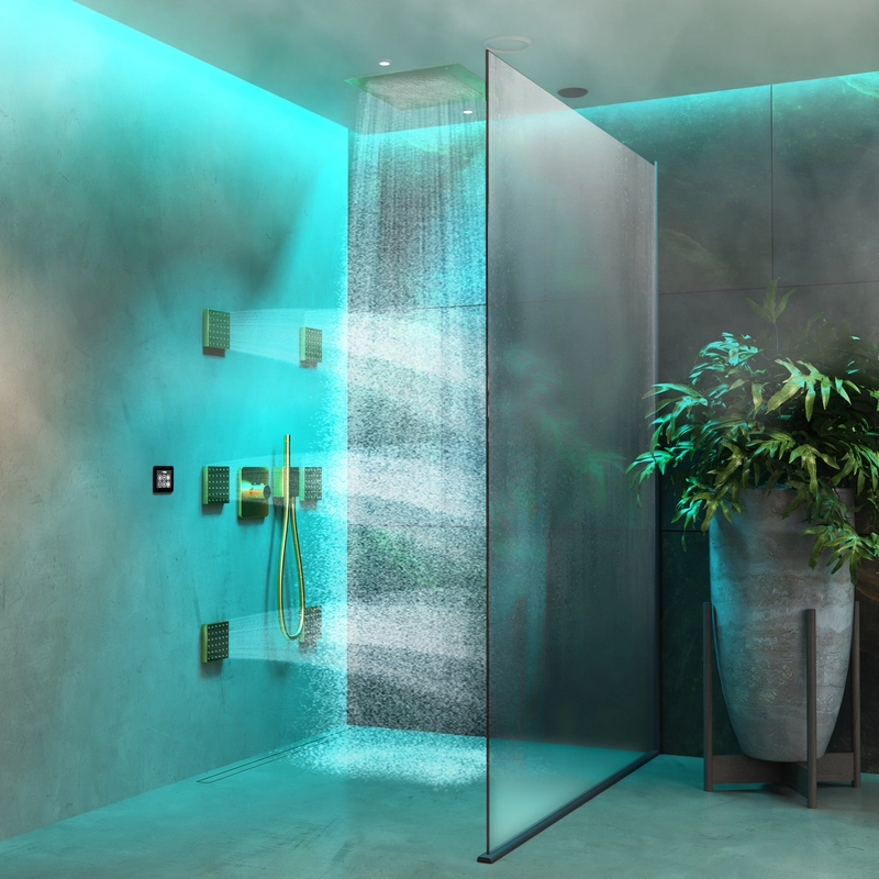 Prysznic Wellness można podłączyć do kranów i pryszniców różnych marek. Sterowanie Shower Deluxe umożliwia aktywację różnych natrysków. Liczba pryszniców określa, ilu użytkowników potrzebuje Wellness Shower. Jeśli preferowany jest prysznic dachowy i prysznice boczne, wystarczy 4 użytkowników. Jeśli chcesz sterować kilkoma natryskami (ręcznym, bocznym i dachowym), prawdopodobnie lepszym rozwiązaniem będzie 6 lub 8 użytkowników. Upewnij się, że ciśnienie i ilość wody (natężenie przepływu) są znane z wyprzedzeniem i że zarządzanie wodą jest odpowiednio skonfigurowane. Prysznic Wellness zawsze wymaga oddzielnego zaworu termostatycznego.